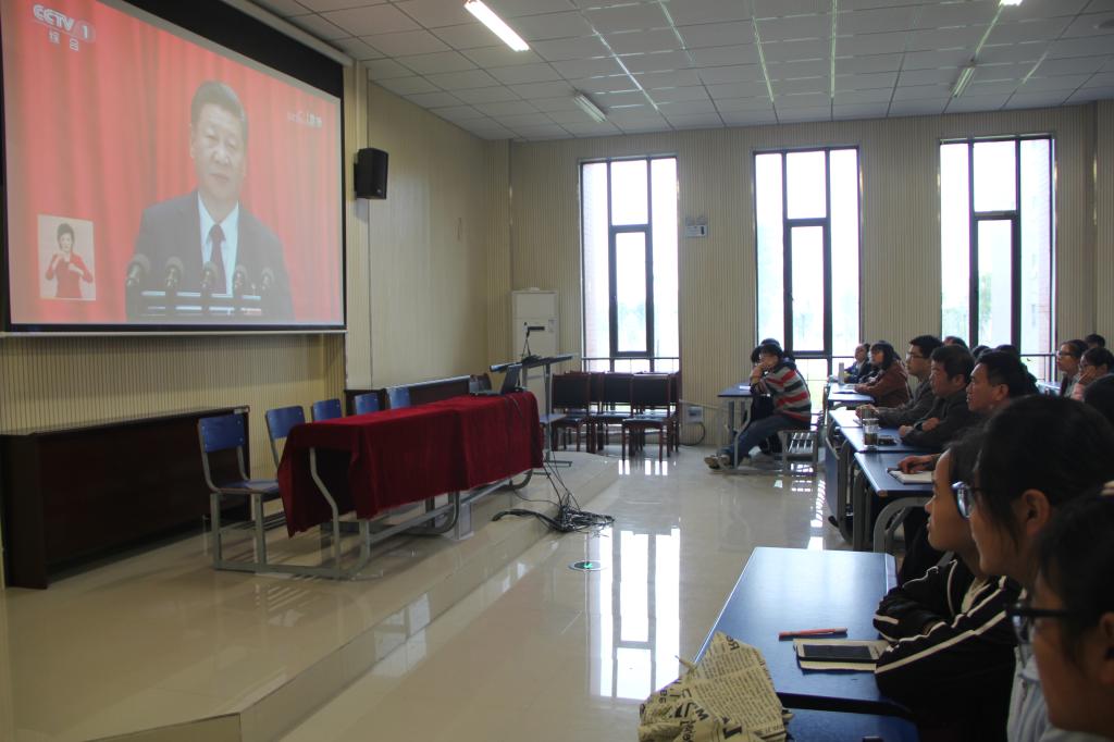 学院领导班子成员、机关科室干部及没课的教师和学生在学院一楼报告厅集中收看了大会实况。报告厅内,大家都在聚精会神的收看习近平总书记的报告,并深深为习近平总书记的报告所打动、所鼓舞,收看现场不时传来热烈的掌声。