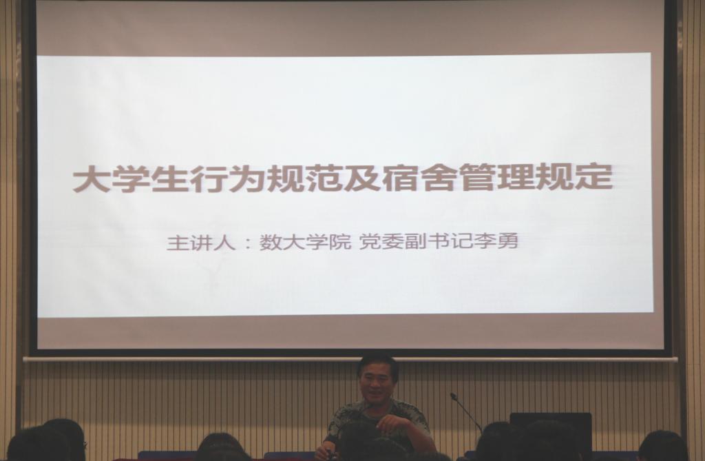 李勇首先向2017级同学解读了大学生行为规范的有关内容,其中包括理想信念教育、学风建设、社会公德法纪、诚信教育、明理修身、团结友善、勤俭节约、热爱生活等主题,希望同学们能严格要求自己,勿要荒废宝贵的大学时光。